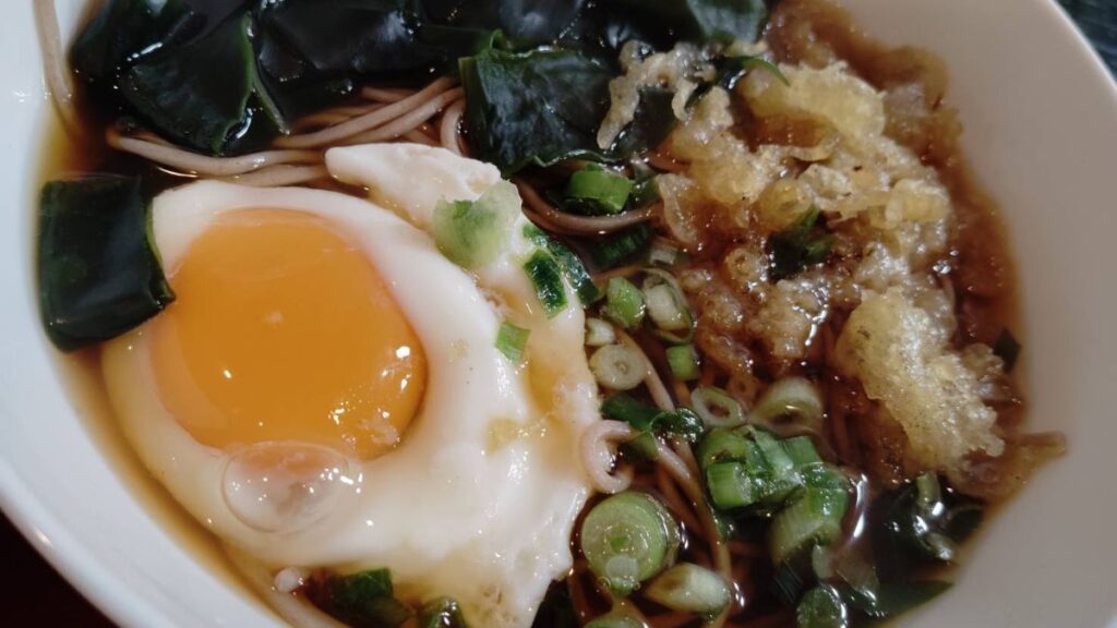 あとは規定時間通りに茹でた蕎麦に、ネギやもどしたワカメ、天かす辺りをトッピングしてツユを注ぐだけです。細かいことは気にしないで食べましょう。